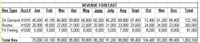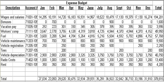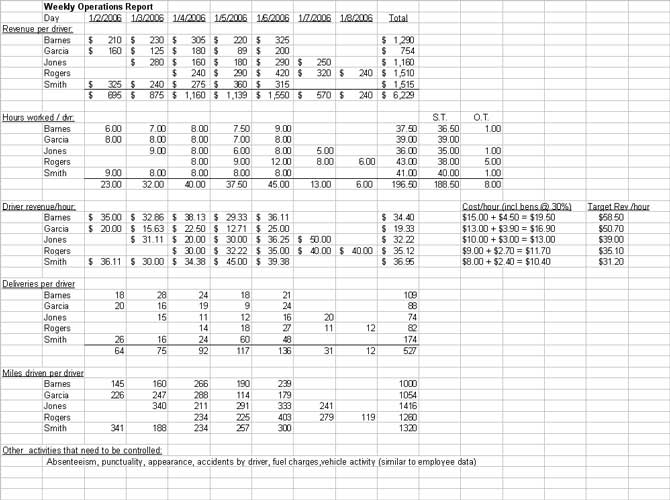 | Purchasers of The Business of Same Day Deliveries are eligible to receive examples of weekly and monthly management reports plus a set of forecasting and budget forms that will help manage and increase a business’ profitability. If you have already purchased The Business of Same Day Deliveries and you wish to receive a set of Management Tools in MS Excel spreadsheet file format, email us with your request. The files will be sent to you as an attachment to his reply. Although the following forms have been designed for use by any small or mid-size business, the examples provided are specifically for couriers and local truckers. The weekly and monthly management reports result in trend information. The forecasting and budgeting forms, which are accompanied by detailed instructions for use, are linked and result in an annual projected income statement that will be the operating target for the coming year’s operations. The budget forms are set-up for minimal data entry, and have been designed for completion by managers who are not spreadsheet experts. Below are examples of the reports: |